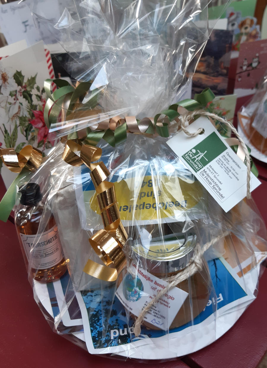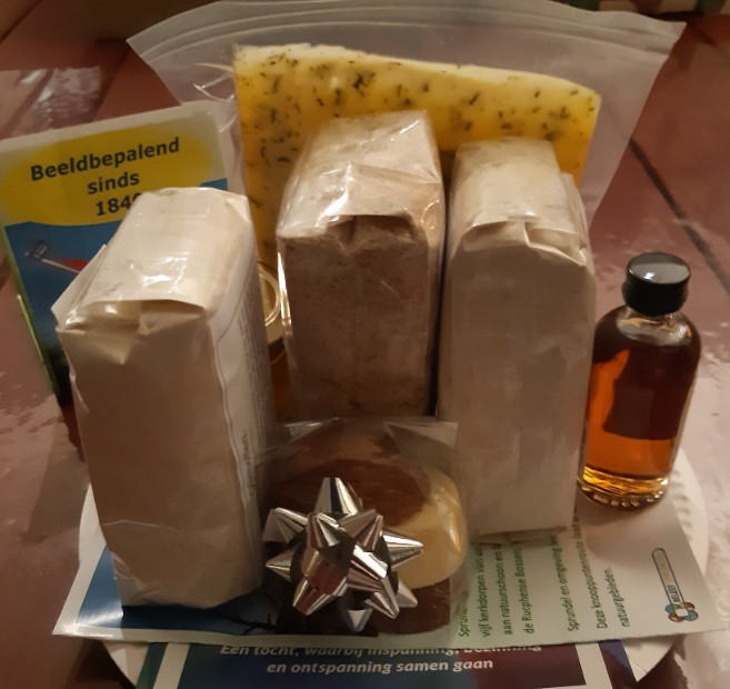 Molenpakket 4 | Pannenkoekenmeel 250 gr, Flesje ‘t Oorschotje, Griesmeel 250 gr, Sprundelse Honing in potje, Muesli 250 gr, Bonbons, Sprundelse Boerderijkaas, Visitekaartje-folder Molen De Hoop. Verpakt in folieverpakking met bodempje. | 17,50 |  |