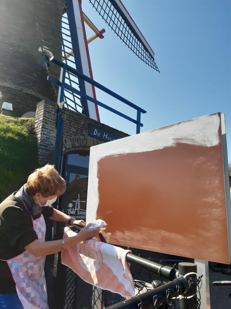 Het infobord bij molen De Hoop Sprundel heeft nu ook een mooie geschilderde achterkant wat bijdraagt aan de beleving op het Molenerf.