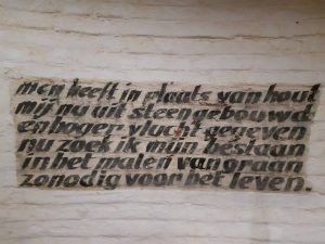 De tekst die op de muur van de meelzolder in molen De Hoop is aangebracht, na de restauratie van de molen in 1977, is in 2021 door de Sprundelse Fiona Broeders, decoratie schilder, bijgewerkt.