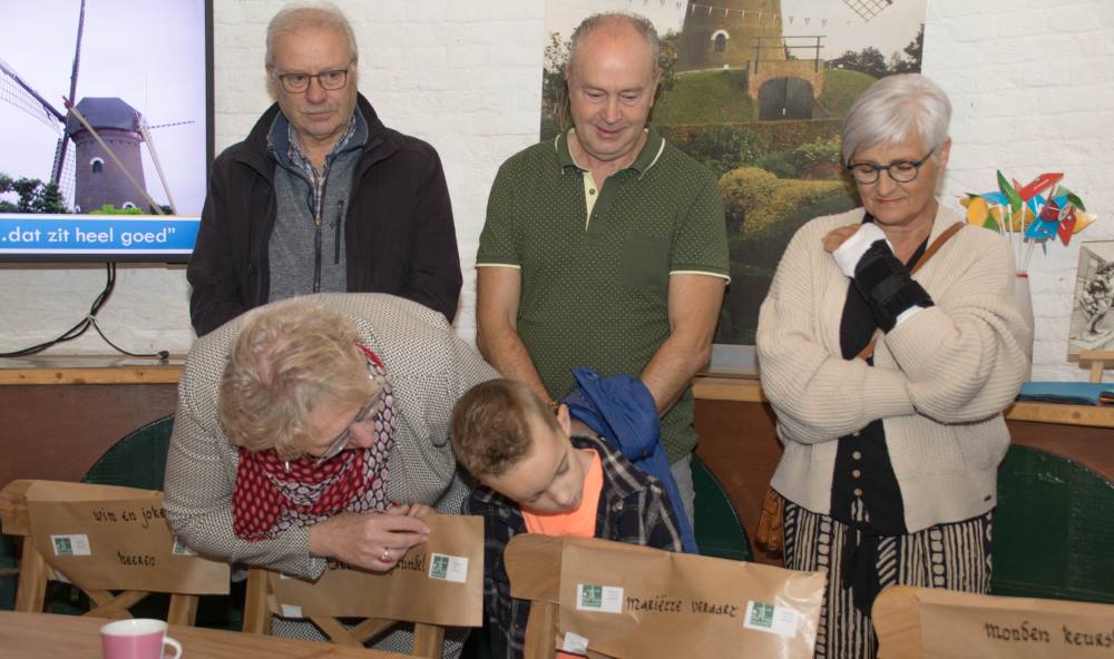 Voorzitter Jan van den Broek bedankte iedereen die een klein of groot bedrag overgemaakt had op de speciale crowdfund-rekening. In het kort schetste hij  hoe de Sprundelse molen een grote metamorfose heeft ondergaan om nu te constateren dat Molen de Hoop er nu nog veel meer  is voor de buurt , de Sprundelse dorpsgemeenschap en zelfs voor de hele gemeente. Het is een Rijksmonument  waar het gezellig is om samen te komen en te genieten van de werking van  dit “krachtig ding” met ranke wieken”. De totale opbrengst van de stoelenactie is uitgekomen op €  2277,50 en dat  was een heel goed resultaat, meer dan er verwacht werd.  Wethouder Suzanne Breedveld stond stil bij het werk dat de vele molenvrijwilligers wekelijks in wisselende samenstelling verrichten en onderstreepte het belang van de betrokkenheid van het onderwijs, bij het op jonge leeftijd kennis laten maken met onze monumenten. Zij benadrukte nog eens dat er veel  molens in Nederland, de naam De Hoop dragen omdat zij voor veel mensen hoop op de toekomst betekende omdat er brood gebakken en verkocht kon worden in de dorpen. . Hierna werden de namen op de nieuwe stoelen onthuld.. De wethouder deed dit samen met Vik, de jongste vriend van de molen die op dinsdag na schooltijd nog even langs komt om de molenaars te assisteren.  Alle sponsoren konden plaatsnemen op hun eigen stoel. De prijs, onder degenen die geld gestort hadden,  werd gewonnen door de dochter van de laatste beroepsmolenaar en eigenaar van de molen.  Hierna was er een gezellig samenzijn met koffie/thee en een koekje. Ook was er een nog  pakje pannenkoekmeel voor iedereen.